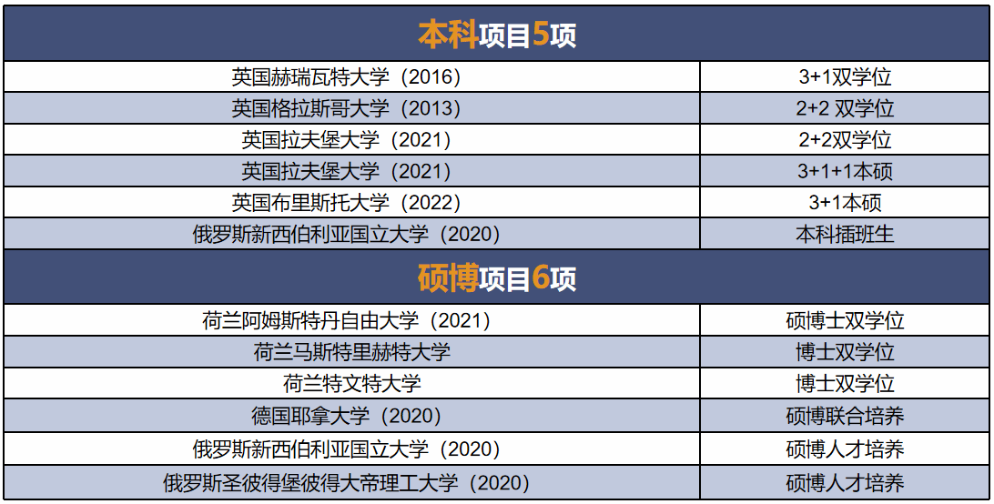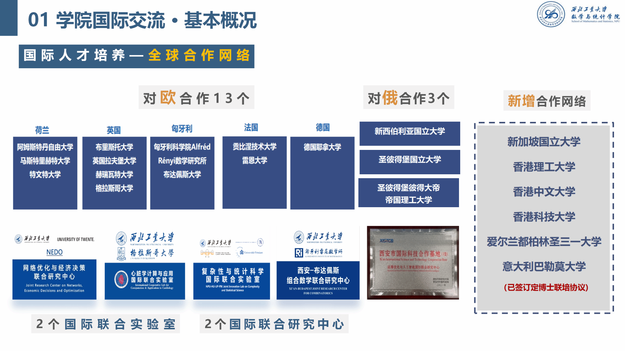 公司秉承“深耕欧洲,拓展俄乌,辐射亚洲”工作思路,持续深化与英国布里斯托大学(QS55)、英国纽卡斯尔大学(QS173)、荷兰特文特大学(QS117)等在本硕博人才培养和科学研究层次的交流合作,拓展新加坡国立大学(QS8)、新加坡南洋理工大学(QS26)、香港理工大学(QS65)、香港中文大学(QS47)、香港科技大学(QS60)、香港城市大学(QS75)、加拿大菲尔兹数学科学研究所国际合作渠道;推进与俄罗斯新西伯利亚国立大学(QS246)、Sobolev索伯列夫数学研究所,圣彼得堡国立大学(QS234)及爱尔兰都柏林圣三一大学(QS98)本科海外毕设、硕士双学位和科研合作;成功与意大利巴勒莫大学签订院级博士联合培养合作协议。同时,组织教师赴外蒙古科技大学进行学术交流,续签2+2本科双学位项目(反向培养)。