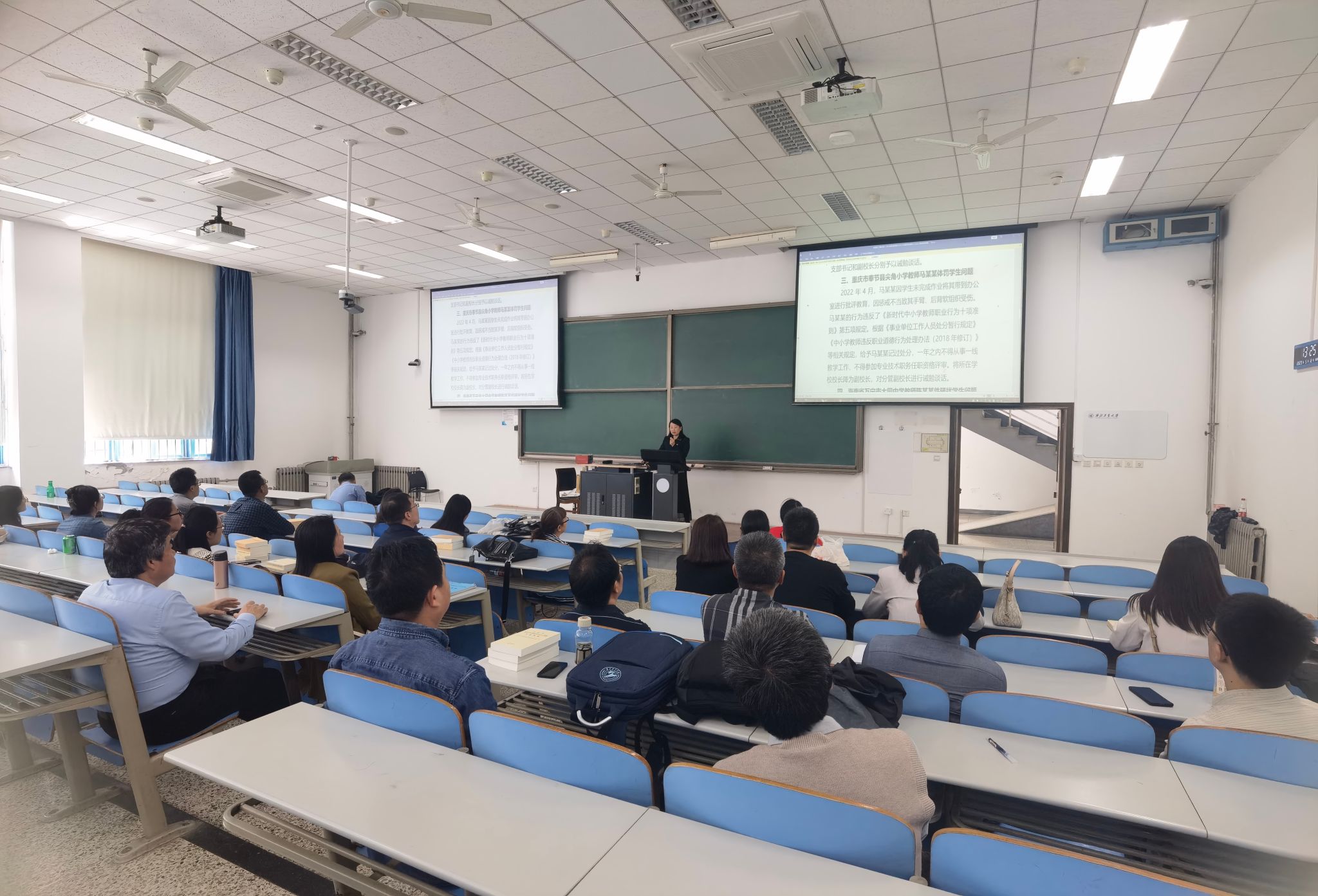 在长安校区数字化大楼广场前,公司党委书记王莉首先带领同志们集体观看学习了公司纪委办公室汇编的10幅有关“漫画说纪”和典型案例的宣传展板,图文并茂的形式使得展示内容更加丰富直观且意义深刻,各支部代表分别带头领学,进一步加深记忆,令人深省。随后,所有同志来到教学西楼D105教室集中观看了公司选取的《清廉中国丨廉方治未病》《密集通报敲响警钟,紧盯隐性腐败、奢靡之风等典型“节日病”》《八项规定是改进作风的切入口和动员令》等微视频内容,以案明纪,使警示教育效果进一步加强。王莉书记说:“希望通过展板和视频内容的学习,使公司党员干部和教职工都能引以为鉴,严格遵守党章党规党纪和有关法律,进一步做到以德修身、以德立学、以德施教,不断涵养清正师风。