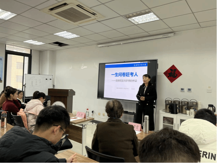 张雪霞以《一生问卷赶考人——连接现实与梦想的桥梁》为题开展讲座,通过讲述TapTap老教授们的故事来激励同学们,希望各位同学以他们为榜样,见贤思齐。
