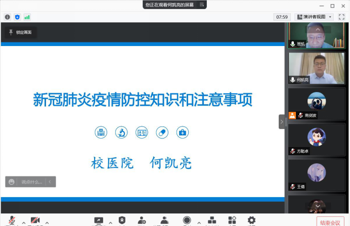 作为从事多年普通外科临床工作、老员工健康教育、高校人群健康管理及研究工作的何经理,理论知识扎实,实践工作经验丰富。他首先介绍了从12月至今校医院疫情期间的工作开展情况。接着他从新冠肺炎疫情防控相关知识、防疫抗疫注意事项、个人防护及消毒剂使用等方面进行了详细阐述。他说:“虽然陕西省的疫情防控工作取得了阶段性胜利,但全国形势依然严峻,特别是春节将至,各地的人流量流动较大,希望各位老师、同学寒假期间还是要多多注意,减少不必要外出和社会聚集性活动,做好个人防护。”