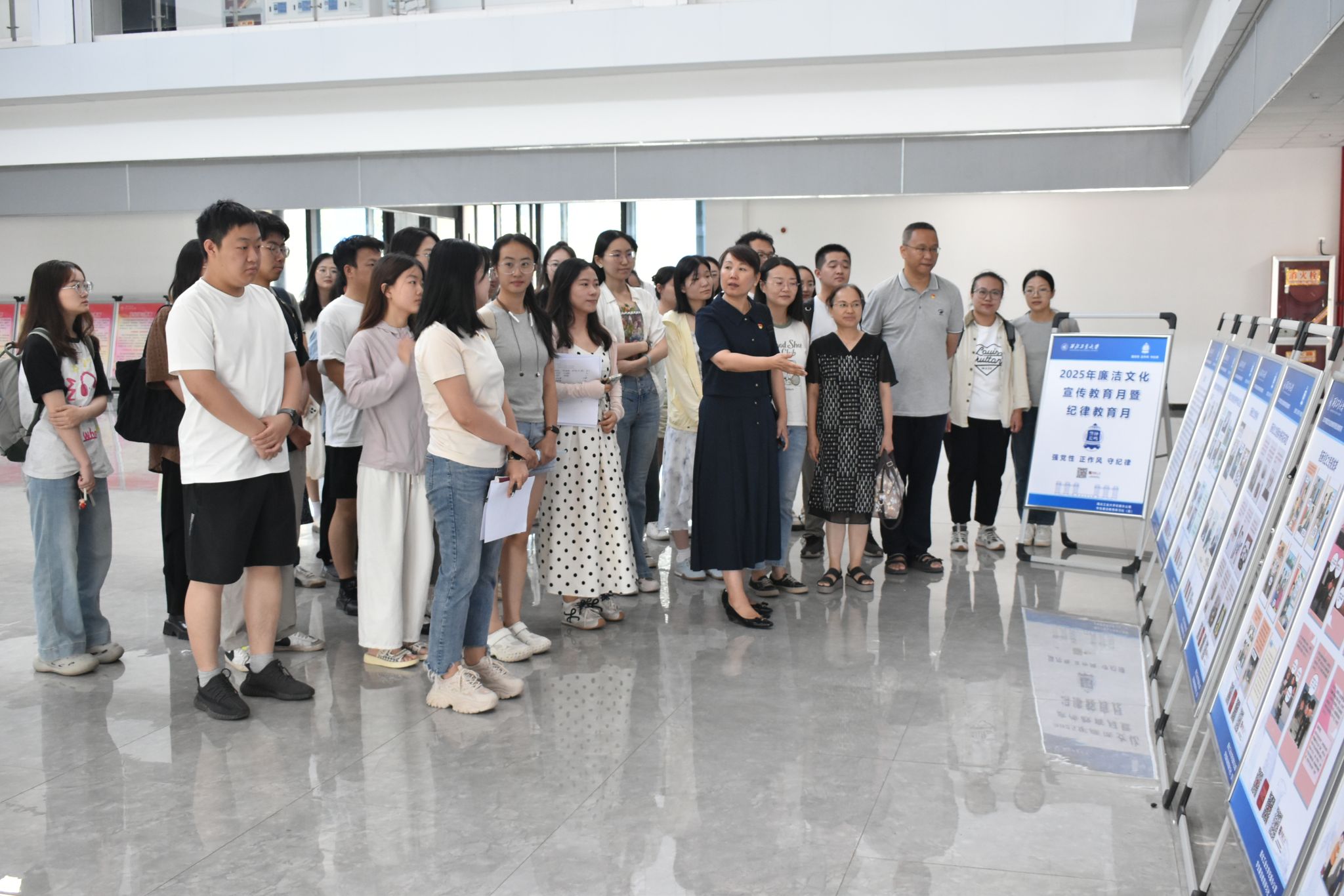 在公司海天苑大楼中厅,王莉带领同志们集体观看学习了公司纪委办公室汇编的2025年廉洁文化宣传教育月暨纪律教育月警示教育宣传展板,通过8幅“漫画说纪”和有关方面典型问题材料聚焦违规吃喝、违规收送礼品礼金等干部关注、师生关心的“四风”问题,重在警示教育党员干部和师生员工遵守党章党规党纪和有关法律,锲而不舍贯彻落实中央八项规定精神。