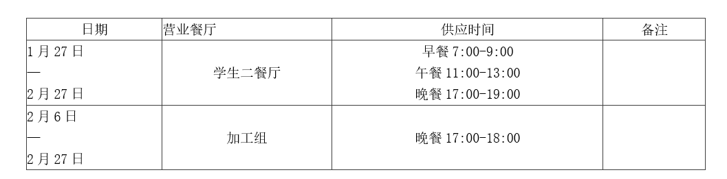 长安校区员工一餐厅、员工二餐厅、员工五餐厅和民族餐厅2月26日午餐起正常供应;其他餐厅2月27日午餐起正常供应。