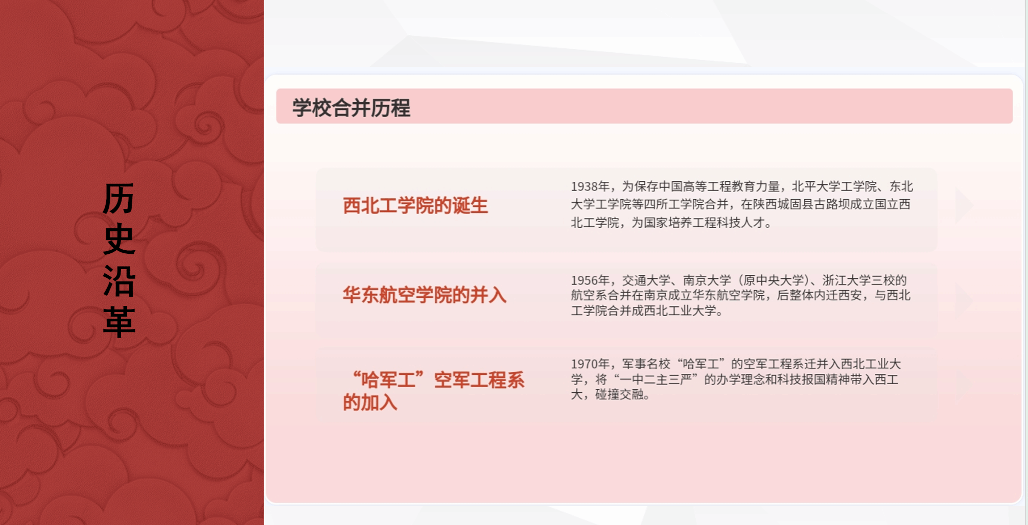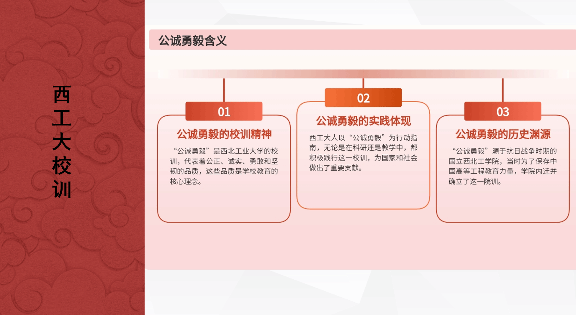 分享会首先解析了"公诚勇毅"校训的深层意蕴。1938年国立西北工公司成立之初确立的"公诚"精神,历经抗战烽火淬炼,在1957年西安航空公司与西北工公司合并组建西工大时,融入"勇毅"新内涵,形成完整校训体系。