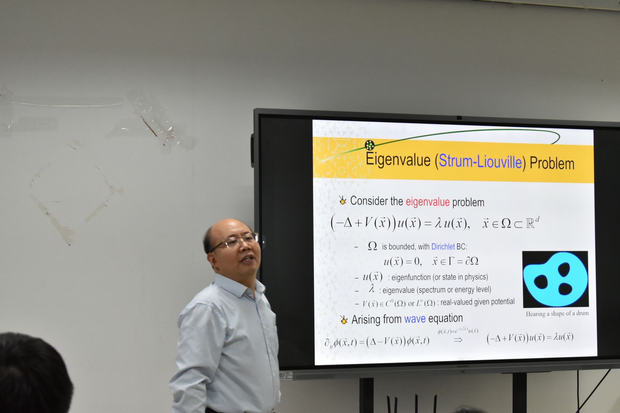 报告伊始,包维柱教授向与会师生详细介绍了新加坡国立大学的概况、教育模式、招生申请流程,以及理公司的学科背景和学术发展情况。接着,包教授深入讲解了在带有Dirichlet边界条件的有界区域上,Laplacian和Schrödinger算子特征值渐进性的Weyl定理和Weyl猜想。他接着提出了分数薛定谔算子(FSO)的广义Weyl定律及基本间隙猜想,并分享了从渐进性分析和数值研究方面对Gross-Pitaevskii方程能量和化学势基本间隙的最新研究进展。