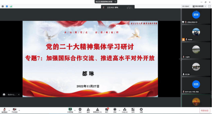 理论学习中心组成员围绕“提升社会服务能力、主动服务社会主义现代化建设需要”“推进文化自信自强、广泛践行社会主义核心价值观”“加强国际合作交流、推进高水平对外开放”“坚定不移全面从严治党、深入推进新时代党的建设新的伟大工程”“防范化解风险挑战,更好统筹发展和安全”五个内容,通过领导干部讲党课的形式,开展了集中学习研讨。此次学习研讨的五个专题以党的建设为基础,统筹推进社会服务能力提升、推进文化自信自强、加强国际合作交流、防范化解风险挑战,将学习二十大精神与公司各项工作紧密结合。