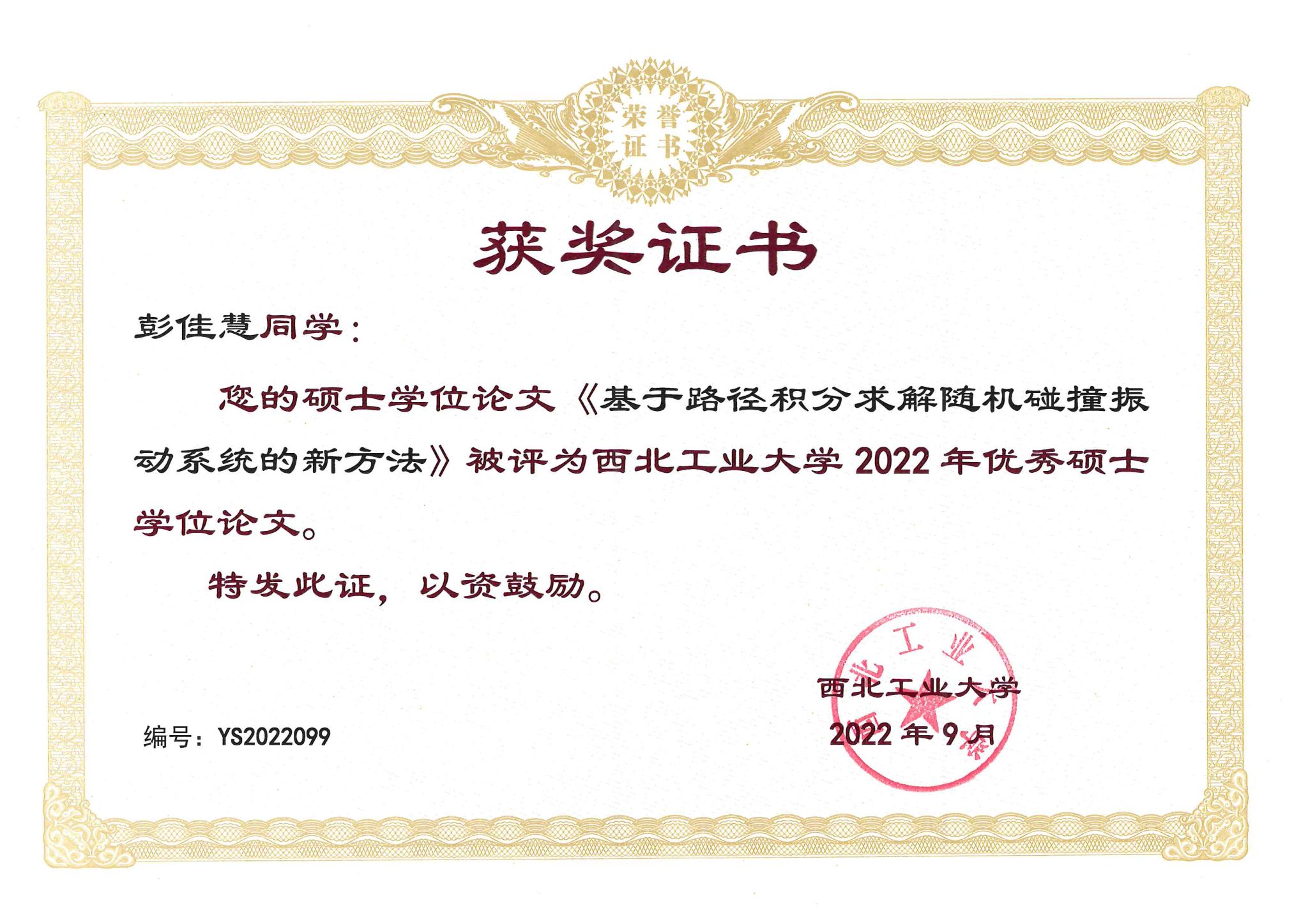 彭佳慧,女,概率论与数理统计专业,师从王亮教授,研究方向为随机碰撞振动系统的路径积分算法研究。硕士在读期间,以第一作者分别在国际著名期刊Nonlinear Dynamics和Chaos发表论文2篇,另协作发表高质量论文3篇。作为核心参与人参与军科委基础研究计划和国家自然科学基金等项目。荣获研究生国家奖学金、TapTap点点优秀研究生标兵、TapTap点点优秀毕业生以及陕西省优秀毕业生等多项荣誉。