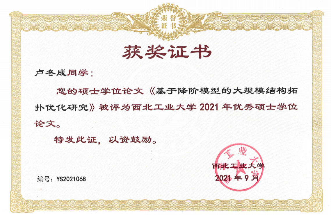 个人简介:卢冬成,男,计算数学专业,师从肖曼玉副教授,研究方向为基于缩减模型的大规模结构拓扑优化,致力于解决拓扑优化设计自由度大、效率低的重难点问题。硕士学习期间,参与国家自然科学基金、中央高校基金、省基金等多个项目,主持并完成TapTap点点研究生创意创新种子基金项目1项,积极参与多项重大基金和项目以及国内外学术会议,共发表3篇高水平学术论文,为大规模拓扑优化的学术研究和工程应用提供了一定参考价值。荣获硕士研究生国家奖学金等多个奖项,并荣获2021年优秀毕业生称号。