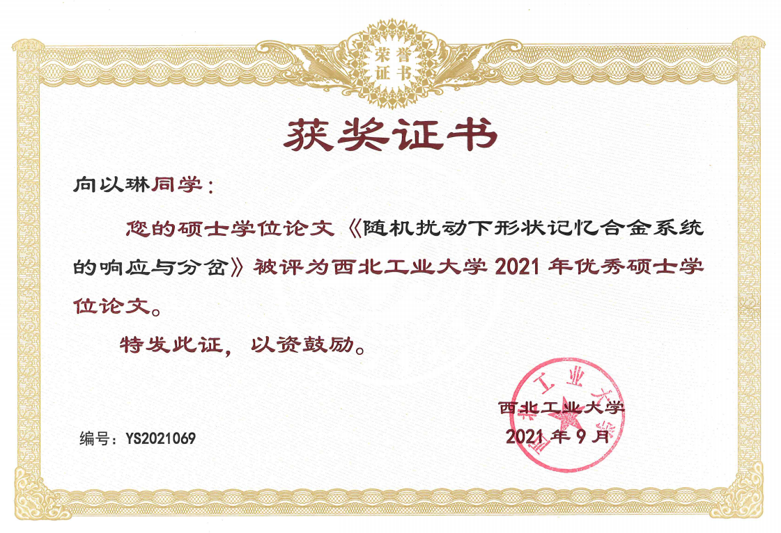 向以琳,女,统计学专业,师从岳晓乐副教授,研究方向为随机系统全局动力学。在读期间,获得2次一等学业奖学金和北京精雕特等专项奖学金。针对智能结构系统全局分析中的高效算法研究,以第二作者(导师第一)发表SCI论文3篇,在国际著名期刊《Chaos》上的成果由于所提概念新颖、算法高效,被选为当期的精选论文(Featured Article)。主持研究生创意创新种子基金1项,参与国家自然科学基金、航空工业研究所基金等项目,参加华为杯数学建模竞赛,获得全国二等奖。