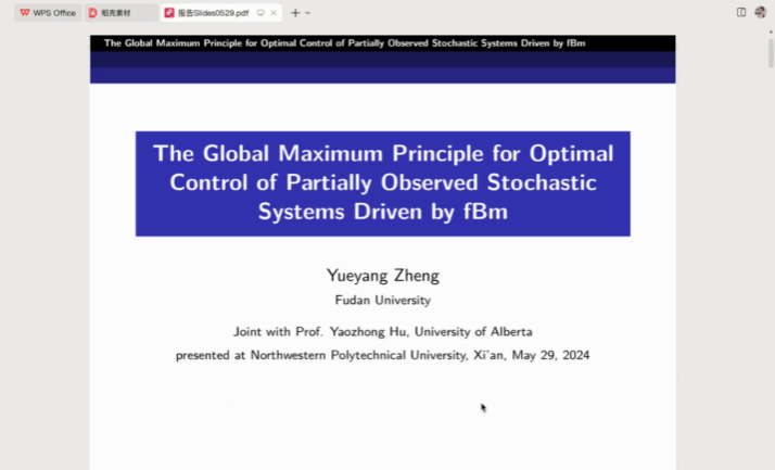 2024年5月29日,TapTap第7期“九章学术沙龙”成功举办。此次沙龙邀请了复旦大学郑越洋博士后作了题为“The Global Maximum Principle for Optimal Control of Partially observed Stochastic Systems Driven by Fractional Brownian motion”的学术报告。30余位师生参会,本次报告由裴斌教授主持。