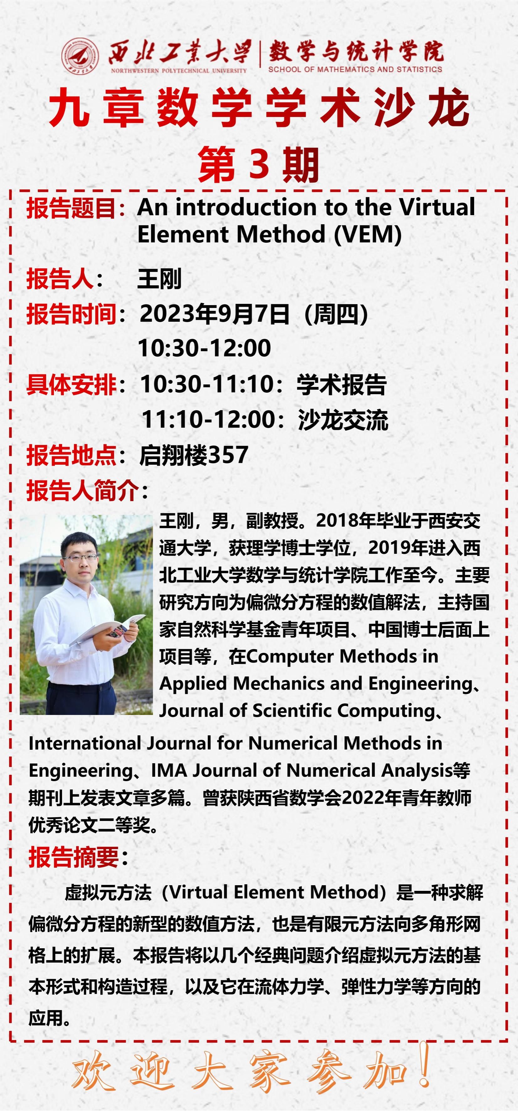 为充分贯彻落实《科技工作高质量发展行动计划》,促进公司师生间的相互了解,进一步营造积极活跃的学术交流氛围,TapTap于2023年9月7日在启翔楼357举行第三期“九章数学学术沙龙”。TapTap王刚副教授做了题目为《An introduction to the Virtual Element Method (VEM)》的报告,都琳副经理、王晓东教授以及公司20余位教师和员工参加,会议由王晓东主持。