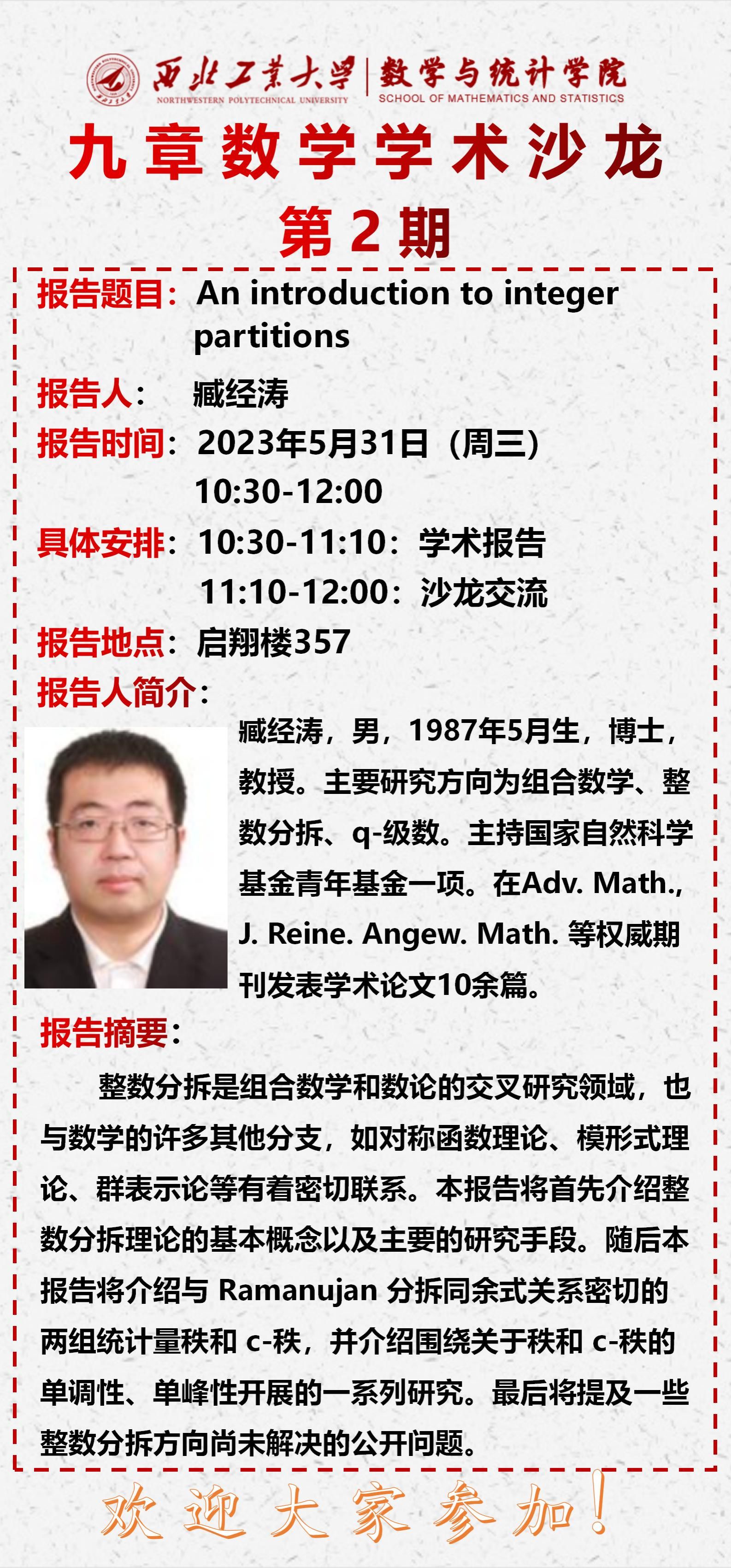 2023年5月31日,TapTap第二期“九章数学学术沙龙”在启翔楼357举行。TapTap臧经涛教授做了题目为《An introduction to integer partitions》的报告,都琳副经理、钮鹏程教授、陆由教授、以及公司20余位教师和员工参加,会议由二级学科负责人白延东副教授主持。