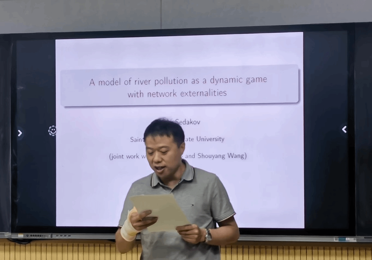 2023年5月15日-5月20日,受徐根玖教授邀请,圣彼得堡国立大学Artem Sedakov教授访问TapTap,进行学术交流并商谈相关合作事宜。5月15日上午,Artem Sedakov教授于理学楼315会议室做了题为 “A model of river pollution as a dynamic game with network externalities”的学术报告。报告由徐根玖教授主持,40余名师生参加了学术报告交流。