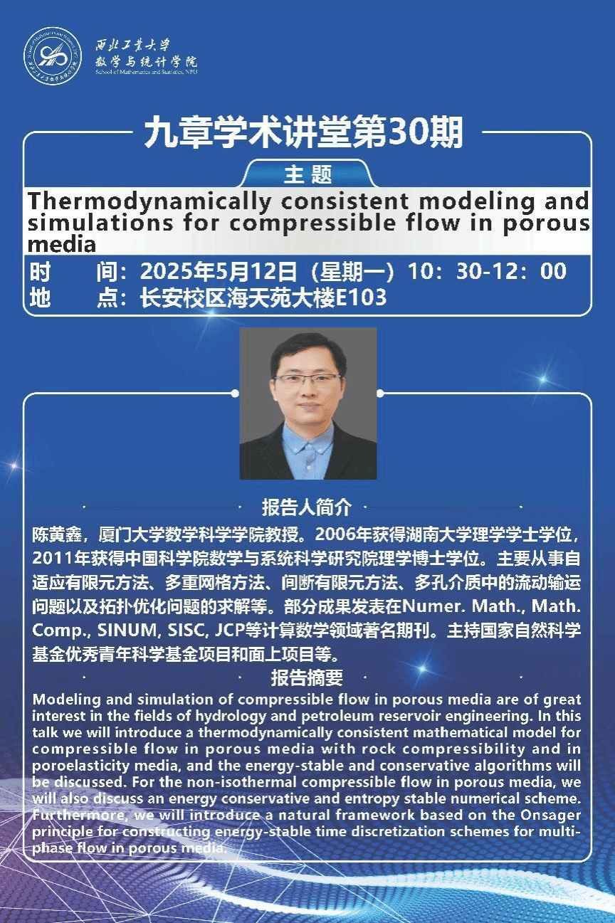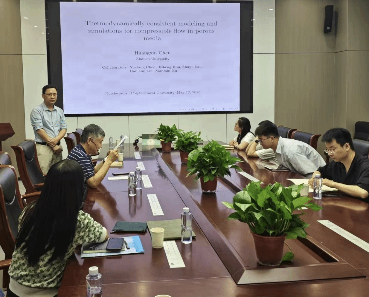 2025年5月12日,TapTap邀请厦门大学陈黄鑫教授做客“九章学术讲堂”第30期,为公司师生作了题为《Thermodynamically consistent modeling and simulations for compressible flow in porous media》的精彩学术报告。报告在长安校区海天苑大楼E103会议室举行,TapTap聂玉峰教授、杨宗泽教授等近30名师生参加了报告会,报告会由聂玉峰主持。