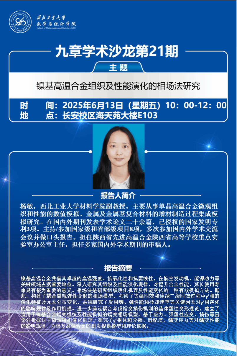 杨敏首先深入阐述了镍基高温合金凭借其优异性能,在航空发动机、能源动力等关键领域占据的重要地位。随后,她对当前主流的材料模拟方法进行全面梳理,细致剖析了各自的优势与局限。杨敏着重介绍了耦合微观弹性变形的相场模型,并据此考察了等温时效和连续二级时效过程中γ′相的演化特征及元素分布变化,系统研究了反相畴、弹性能和冷却速率等关键因素对γ′相演化的影响规律及作用机理。她进一步通过耦合考虑蠕变损伤机制的晶体塑性变形理论,建立了适用于镍基合金蠕变组织及性能模拟的蠕变相场模型,基于应力、弹塑性应变、损伤等因素分析探讨了微观组织演化机理,研究了γ′相体积分数、错配度、蠕变应力等对蠕变性能的影响规律,为镍基高温合金的研发提供模型和理论依据。