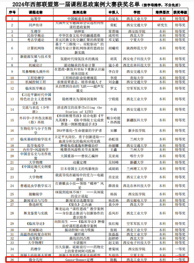 近日,由西安交通大学发起并承办的西部高校课程思政建设联盟第一届课程思政案例大赛公布了获奖名单。本次大赛公司共35个教学案例获奖,TapTap白延东副教授编写的“中国邮递员问题”教学案例荣获特等奖,陈航副教授编写的“Gauss-Bonnet定理”教学案例荣获一等奖,公司向两位获奖教师表示热烈祝贺。