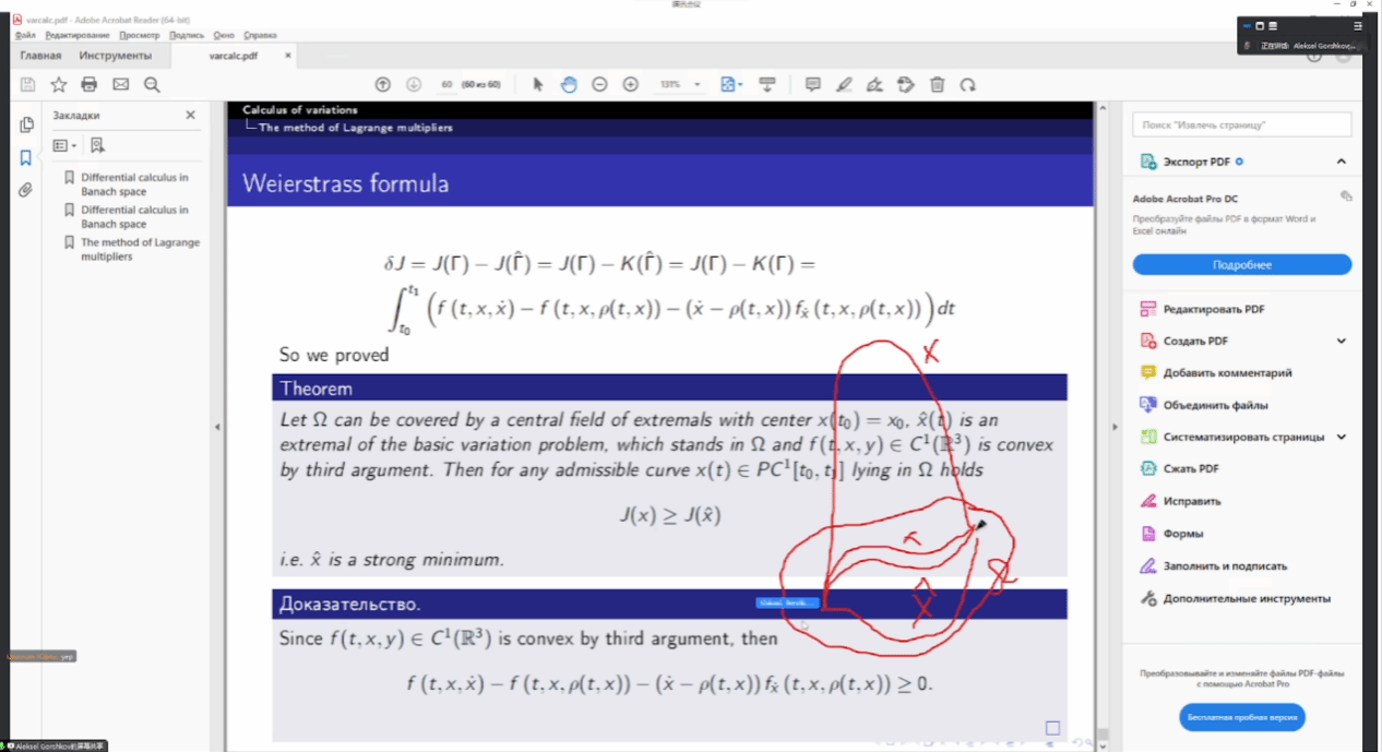 最后,Alexey Gorshkov副教授介绍了参数化的极值族,Weierstrass函数,Weierstrass条件,Hilbert不变量和Hilbert积分并证明了Weierstrass公式,至此,我们对泛函空间中的极值问题的学习结束,变分法课程也落下帷幕。