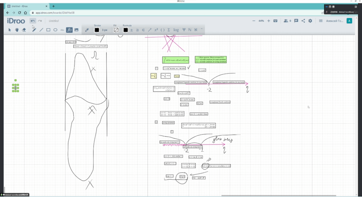 课程初始,Alexey Gorshkov副教授讲述了变分法的历史,变分法来源于古老的最速降线问题。Alexey Gorshkov副教授从有限维极值问题引入,分别回顾了函数的条件极值和非条件极值。定量地描述了一阶和二阶情况下局部极值的充分必要条件。在解决局部极值的同时,带领员工回顾了高等代数中的Sylvester准则,建立起了Euclid空间中导数和Banach空间中导数的联系,通过大量的示例探究了如何求泛函的导函数。