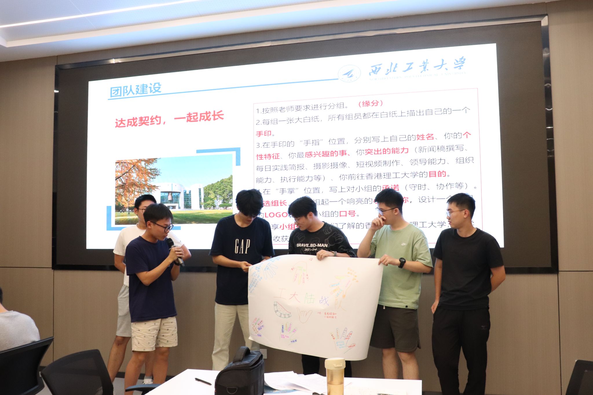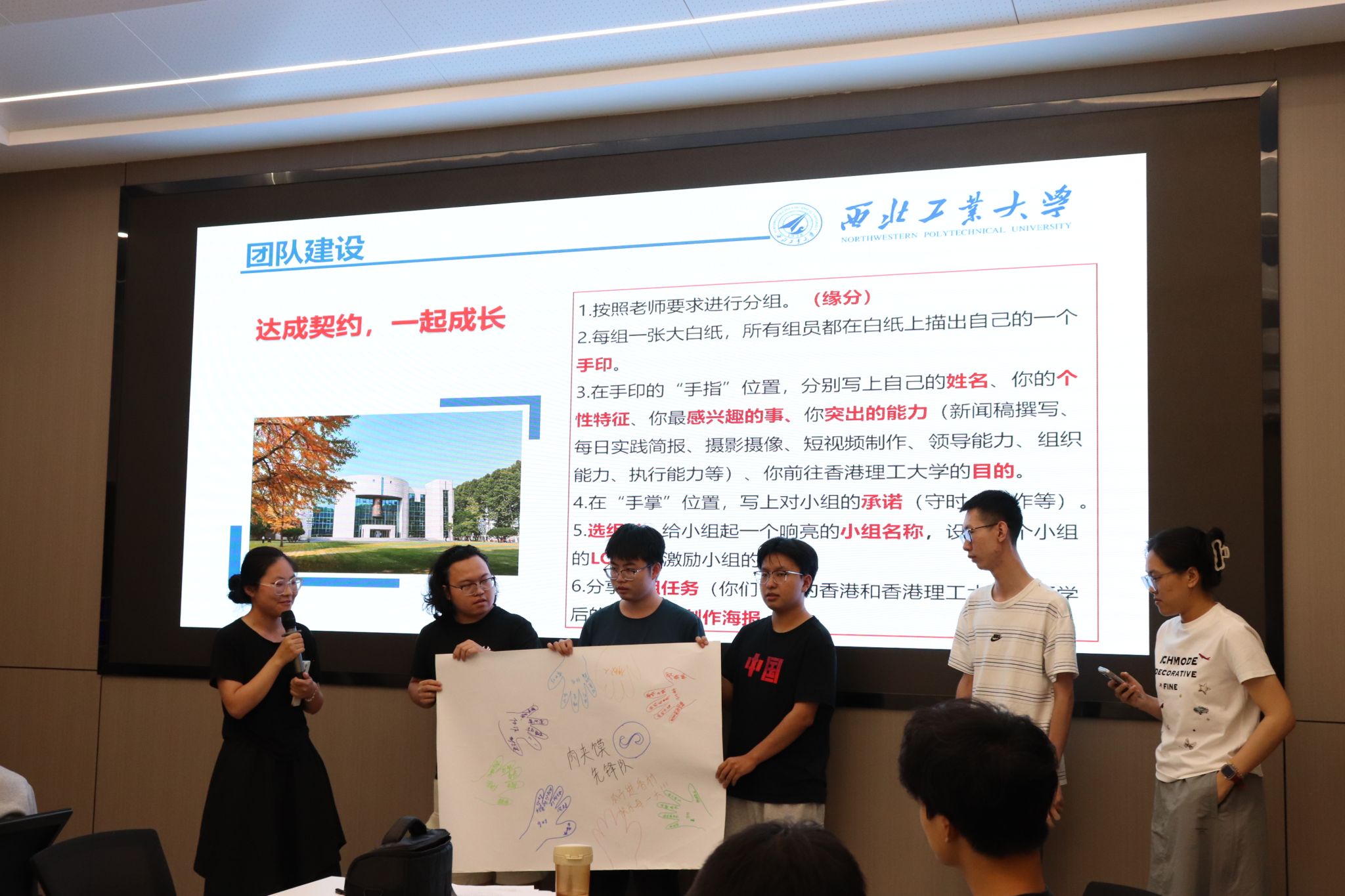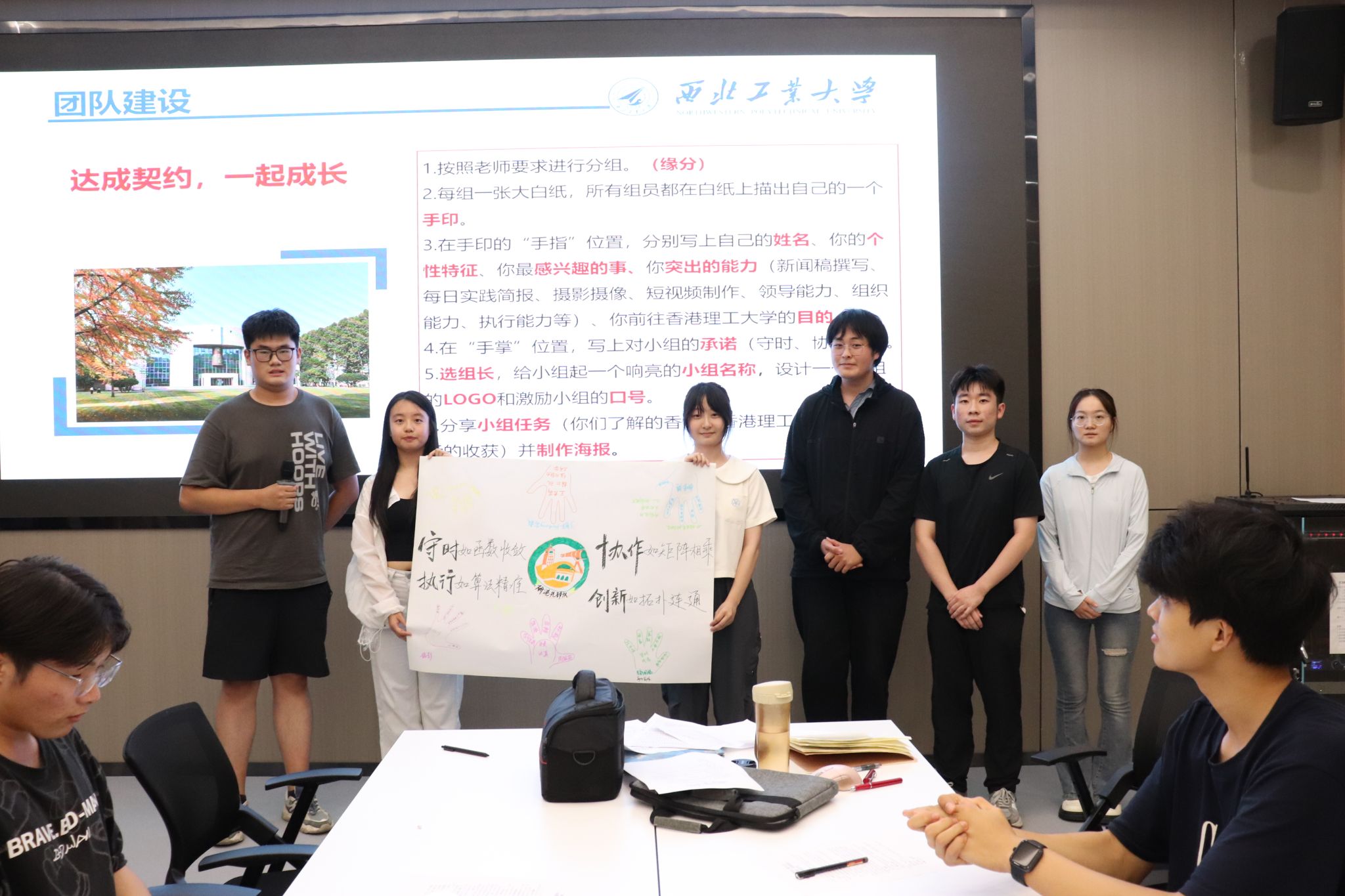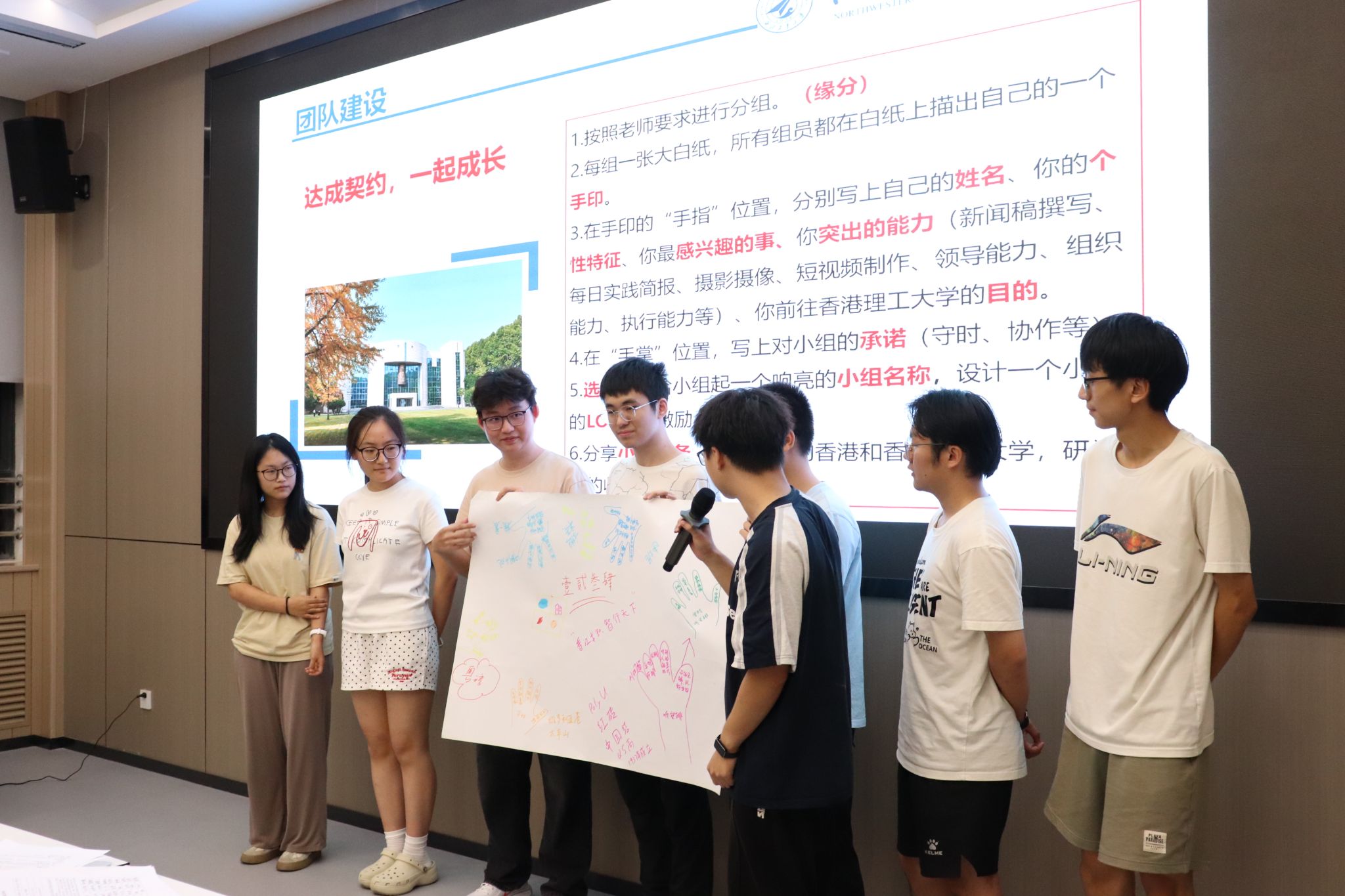 培训会上,王莉书记主要围绕团队意识培养展开核心培训,以“破冰行动”为切入点,带领员工开展团队建设。全体员工共分7个小组,依次完成“手印契约”绘制、小组文化设计等任务——各组成员在空白纸上描下手掌轮廓,于手指位置标注姓名、个性特征及专项技能,在掌心区域共同签署团队承诺。随后,各小组依次展示团队海报,介绍队名、LOGO及口号,并围绕 “香港文化认知”“研学预期收获”进行主题分享。“工大陆战队”“研港先锋队”等小组以海报与生动讲解赢得阵阵掌声,迅速凝聚团队共识,现场气氛热烈。