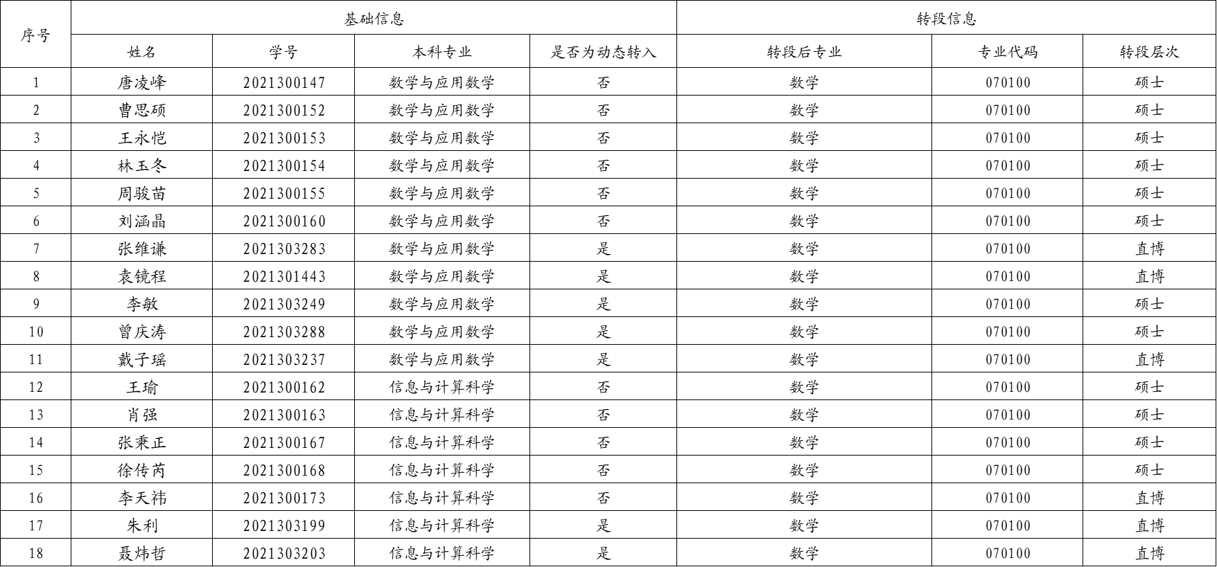 经公司研究生招生工作小组审核通过,现将公司 2021级强基计划转段拟录取名单公示如下: