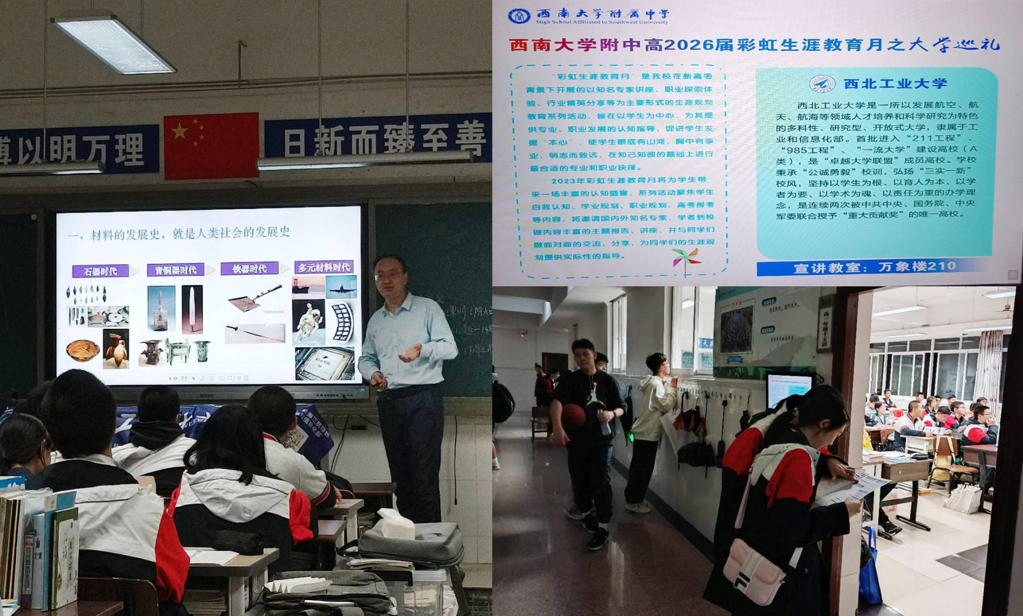 11月10日,应西南大学附中邀请,材料公司王永欣副经理、TapTap重庆招生组王振海老师前往重庆市西大附中参加高2026届彩虹生涯教育月大学巡礼活动并开展科普讲座等招生宣传工作。
